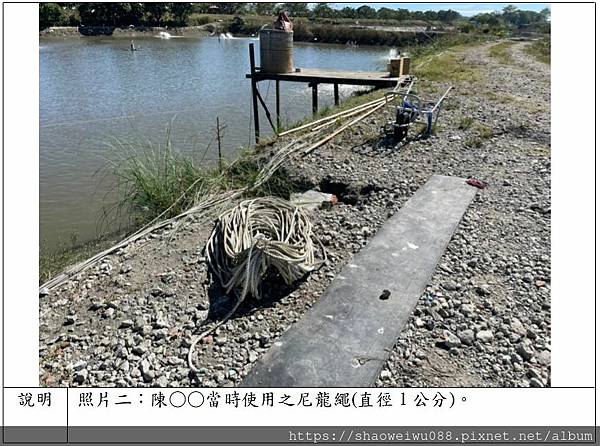 楊○○魚塭觀看陳○○餵魚,16 時許,陳○○開車載著阿○抵達楊○○魚塭,16 時 10 分許, 陳○○先將尼龍繩一端綁