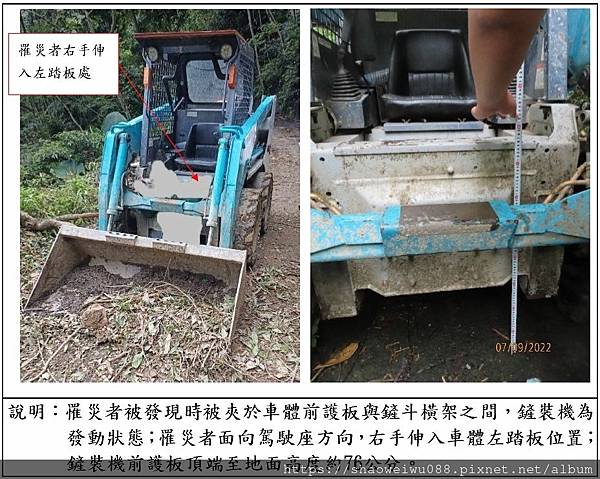 因故於鏟斗升起且未熄火狀態下離開鏟裝機,並於踩踏車體前 護板頂端欲回到鏟裝機駕駛座上繼續作業時,因前護板頂端距 地面高度約76公分不易攀登,導致湯員於攀登過程滑倒並伸出 右手欲撐住身體卻誤壓到鏟裝機左踏板上端造成鏟斗立即下降, 湯員未及逃出即遭夾於鏟裝機前護板與鏟斗橫架間,造成胸部 骨折致創傷性休克,經送醫救治仍因傷重不治死亡。