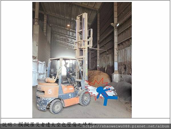 (一) 111年10月6日上午10時59分許,罹災者陳○○駕駛堆高機將裝 滿原料之太空包(重約1公噸、高約1.6公尺)從作業區運至備貨區 後,將貨叉舉升至距地高約2.3公尺後,下車走到堆高機貨叉下 方要解開太空包卸料口的繩子以進行下料作業時,太空包的4 個吊耳因被約1公噸的重量拉伸加上摩擦堆高機之貨叉邊緣而 斷裂,太空包瞬間落下壓中正在下方解繩的罹災者陳○○,經 送 彰 化 基 督 教 醫 療 財 團 法 人 二 林 基 督 教 醫 急 救 治 療後,因顱內出血、顱骨骨折,致腦死死亡。