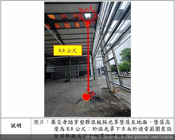 (一)直接原因:罹災者踏穿高度8.8公尺之塑膠浪板採光罩墜落至1樓地面,導致傷重死亡。