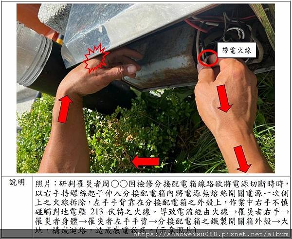 25 分許,周○○以通訊軟體 Line 撥打視訊電話給已經下班的工務部 經理胡○○,表示使用驗電筆檢測涼亭旁之高路燈、矮路燈燈桿時, 因無法明確確認何處漏電,當下胡○○請周○○將電源切斷,明天再 找廠商維修即掛斷電話,18 時 27 分許,現場遊客發現周○○被電到 且趴在涼亭旁之分接配電箱上,立即跑到涼亭對面之園區餐廳告知櫃 台人員謝○○,謝○○立即撥打 119,並通知會計陳○○,陳○○立 即趕往涼亭旁分接配電箱,發現周○○趴在地上,18 時 37 分許,救 護車抵達後先對周○○實施 CPR,隨即將周○○送往台灣基督長老教 會馬偕醫療財團法人台東馬偕紀念醫院急救,延至 111 年 6 月 27 日