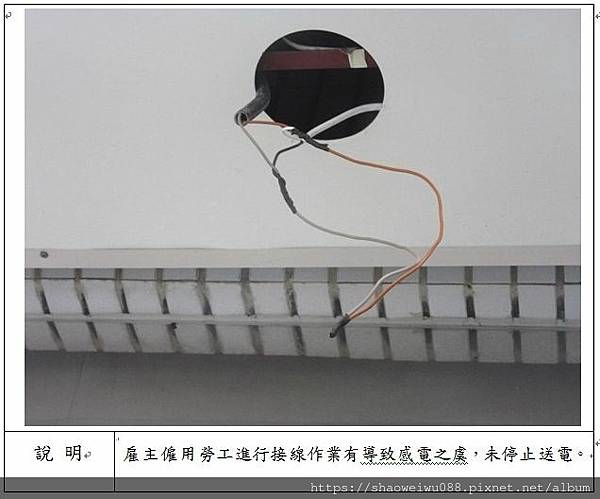 (二)旭○公司承攬士林區○路○段○號裝修工程之水電工程,當日林罹災者於 工地1樓進行接線作業,因未停止送電導致林員感電後受到驚嚇,自合梯跌落地面,造成腰部撞傷。