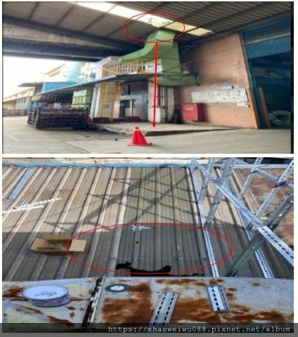 五、發生經過:罹災者於工廠之 1、2 廠房間之通道上方高度 7.8 公尺鐵皮屋頂從事太陽能系統管路支撐架安裝作業時,因未事先規 劃安全通道,於屋架上設置適當強度且寬度在 30 公分以上之踏 板,並於下方適當範圍裝設堅固格柵或安全網等防墜設施,亦未使罹災者確實使用安全帶,致發生踏穿採光罩墜落地面造成頭部撞擊受傷,送醫仍宣告不治死亡。
