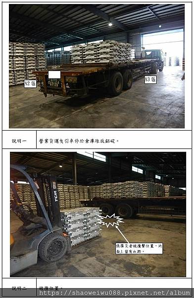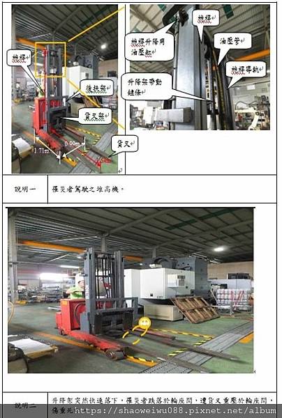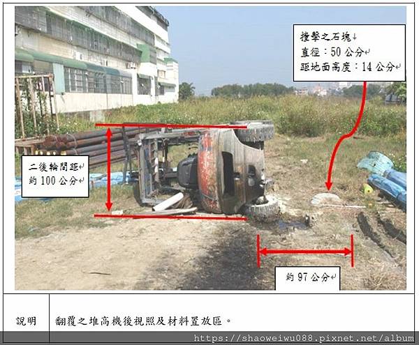 (二) ○○企業有限公司指派現場鄭○○駕駛堆高機把堆置於棧板上未綑綁的木材堆搬 運至定位,碰撞到下層貨物的左前緣上端,然後堆高機又往前開且同時再升高貨叉