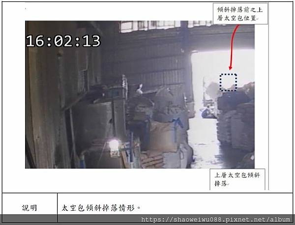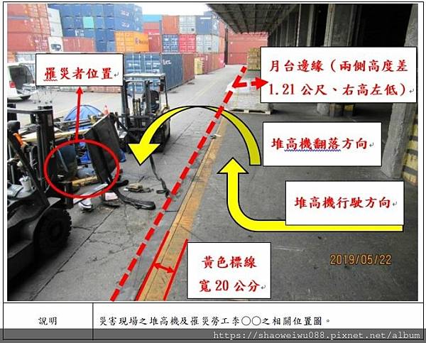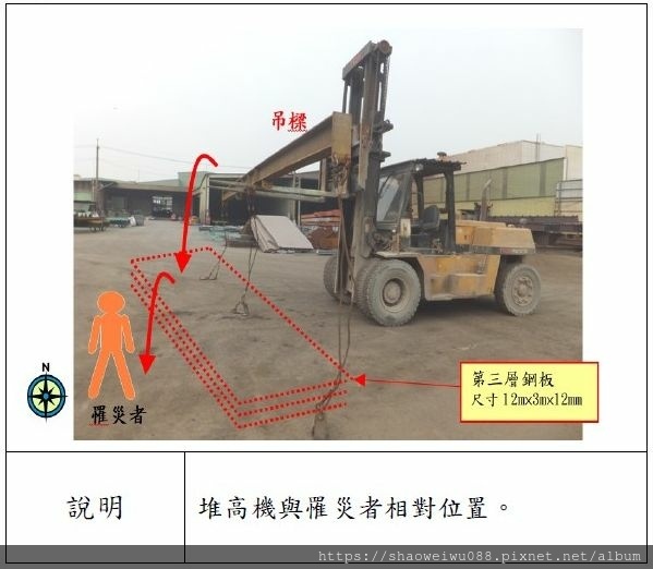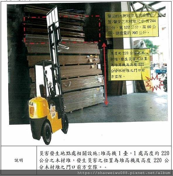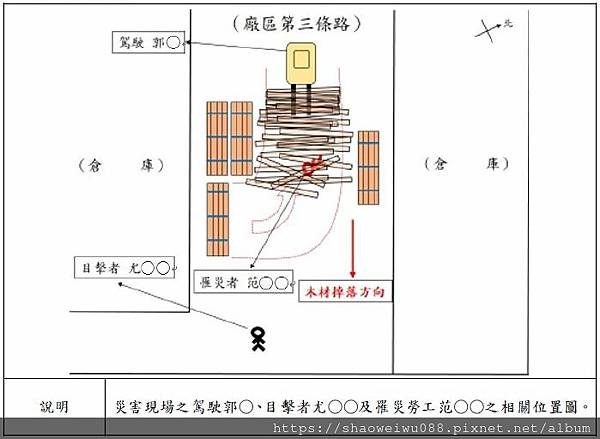 過程中,未綑綁的木材堆上方木材滑動,導致木材堆重心偏移,最後木材堆連同棧 板翻轉下來,壓砸到當時正站在門口邊理貨未戴安全帽的施○○,後經救護車將施
