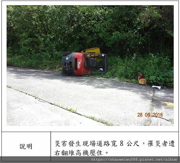 105 年 6 月 28 日上午 6 時許,勞工郭罹災者於道路操作堆高機翻覆遭壓,經送醫院急救,
