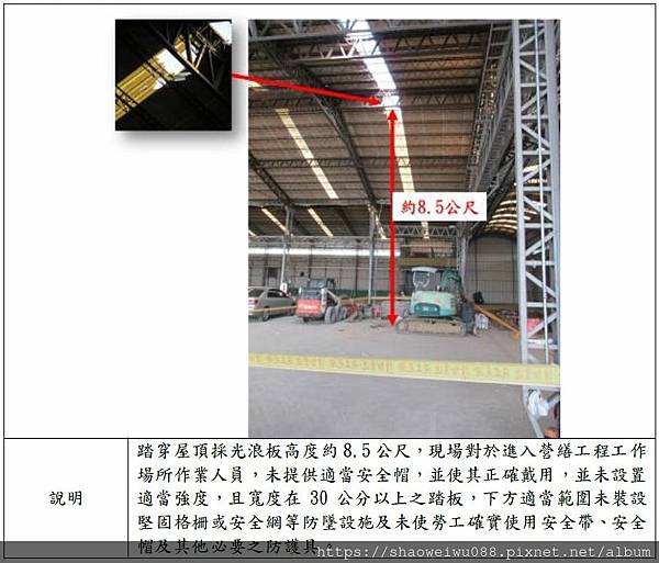 (一)直接原因:踏穿距地約 8.5 公尺高之屋頂採光浪板墜落至地面,導致傷重致死。