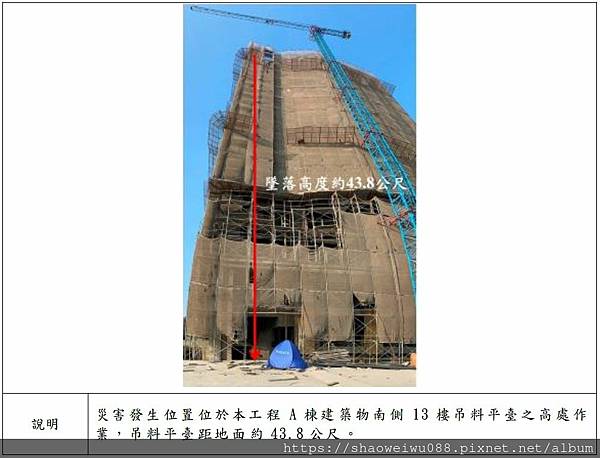 108 年 1 月 9 日 8 時至 12 時:○○有限公司李○庭分配各工作內容後開始作業。當日 12 時至 13 時午休時間後,○○建設股份有限公司之工程師吳○瑋於地下 1 樓進行施 工品質查核;○○營造工程股份有限公司之工地主任蔡○樺於工務所內執行行政工作;○○有限公司之李○庭、邱○棋及罹災者等人持續當日上午分配之工作。14 時 00 分許, 罹災者於 A 棟 13 樓高度約 43.8 公尺之吊料平臺進行模板材料堆疊綁紮作業,模板材料 堆疊於吊料平臺約 285.3 公斤時,吊料平臺構件之背撐材與固定材(即 12 號鐵線)突然脫落,造成吊料平臺倒塌,模板材料與罹災者墜落至地面。罹災者墜落後,○○有限公 司之李○庭於無線電上呼救,○○建設股份有限公司之工程師吳○瑋於無線電上聽到呼 救後,立即協助通報 119。救護車到達現場後,由 119 救護人員判定當場傷重不治死亡, 未送往醫院,後續送往殯儀館。