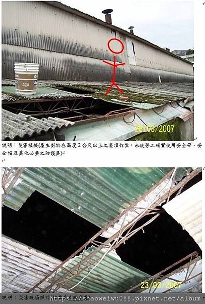 ○○營造股份有限公司工事長王XX於96年3月21日巡視工地時發現鄰近該工區東北側之OO公司工廠屋頂有破損之情形,於96年3月22日上午8時30分即自行指派工程師高XX帶領罹災者至OO公司工廠屋頂處,由罹災者進行修復作業;至上午11時許,罹災者於屋頂作業時,因踏穿石綿板墜落至工廠內,先撞擊工廠內覆蓋於舊機械上之彩色鋼製浪板後(落距約1.3m),再翻落至地面(落距約1.5m),墜落高度共2.8m,經緊急送往馬偕紀念醫院淡水院區急救,延至96年3月27日凌晨死亡。
