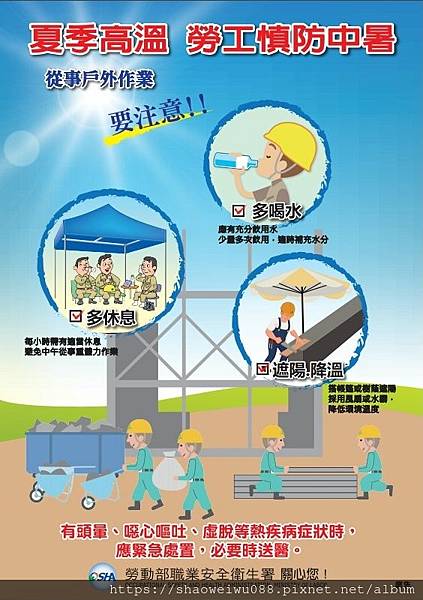 此外,夏季為職災高峰期,職安署也特別籲請勞工朋友,除應提高安全意識外,本身也應保持良好的飲食、睡眠及生活習慣,並隨時注意自己身體狀況。另為加強宣導,該署已編製「夏日戶外作業慎防中暑」之宣導海報及資料,事業單位可至該署網頁(http://www.osha.gov.tw)下載使用;另外,也可以至衛生福利部國民健康署於官網(http://www.hpa.gov.tw)之「預防熱傷害衛教傳播專區」,瞭解熱疾病相關訊息。