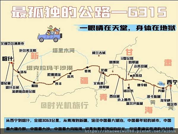 青海西寧-共和-德令哈-芒厓-若羌-且末-民豐-和田-莎車-喀什 (眼睛在天堂,身體在地獄) 穿越柴达木无人区,足以媲美美国的66号公路,起点为青海西宁,终点为新疆喀什,穿越罗布泊无人区和塔克拉玛干沙漠的博大、荒凉和艰难 |