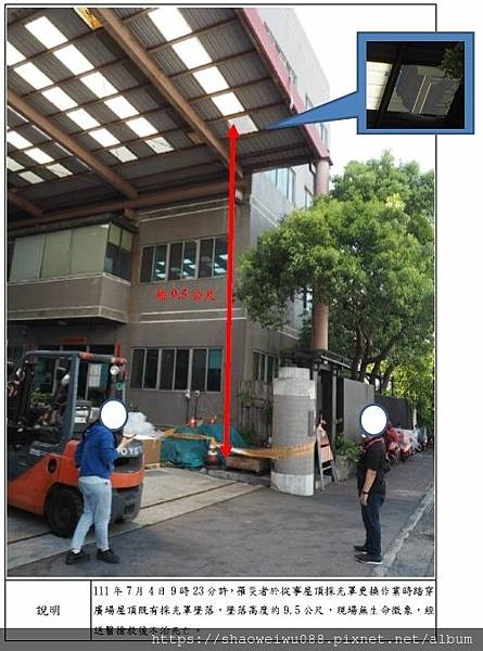 時往屋脊側移動欲搬扶該新採光罩之南端,許員於另一側負責搬 扶北端,楊員於移動過程中即聽聞聲響,回頭見許員已踏穿既有塑膠採